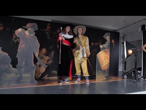 Verkleed in historisch kostuum, op de foto in vier beroemde vaderlandse kunstwerken. Stap, gewapend met penseel, het atelier van Rembrandt in. Kruip in je lendedoek op de tafel van De Anatomische Les, neem plaats naast Rembrandt in het Historiestuk met zelfportret of strike a pose in de Nachtwacht.